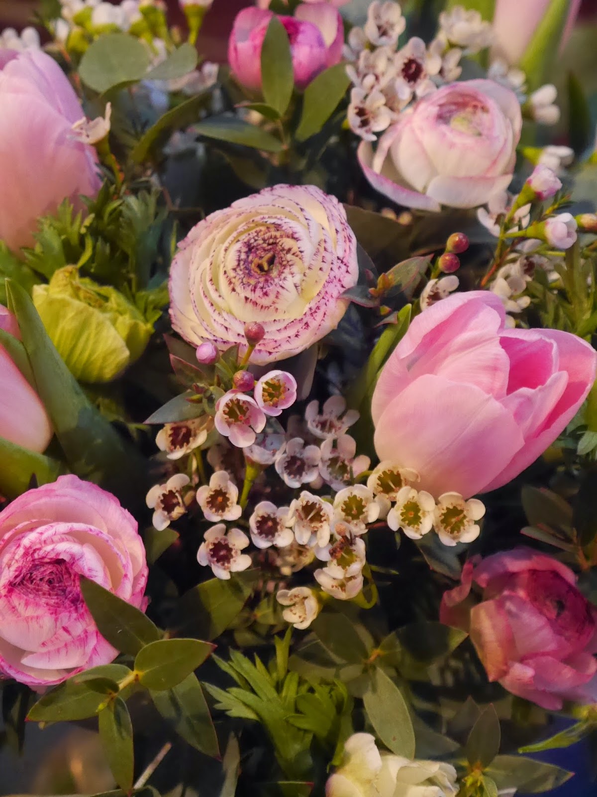 Grâce à Estelle et son atelier « bouquet rond », ce mélange de tulipes, renoncules, anémones, wax flower et eucalyptus est venu ensoleiller ma semaine… Un des secrets de ce type de bouquet: « bien partir en vrille »… apparemment je sais faire;-)