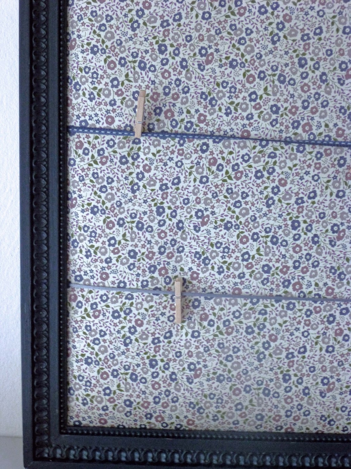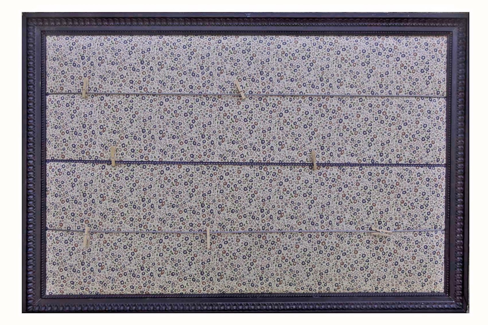 Envie d’un joli cadre pour afficher et accrocher facilement des notes, des photos, des articles… l’idée est là, ça mijote… et puis je tombe dans un grenier sur de vieux cadres, tiens tiens, celui-là me plaît bien… peut-être qu’une fois nettoyé… et puis avec ce beau tissu… ça continue de mijoter jusqu’au jour où je me décide de passer en mode action! Et voilà le résultat: